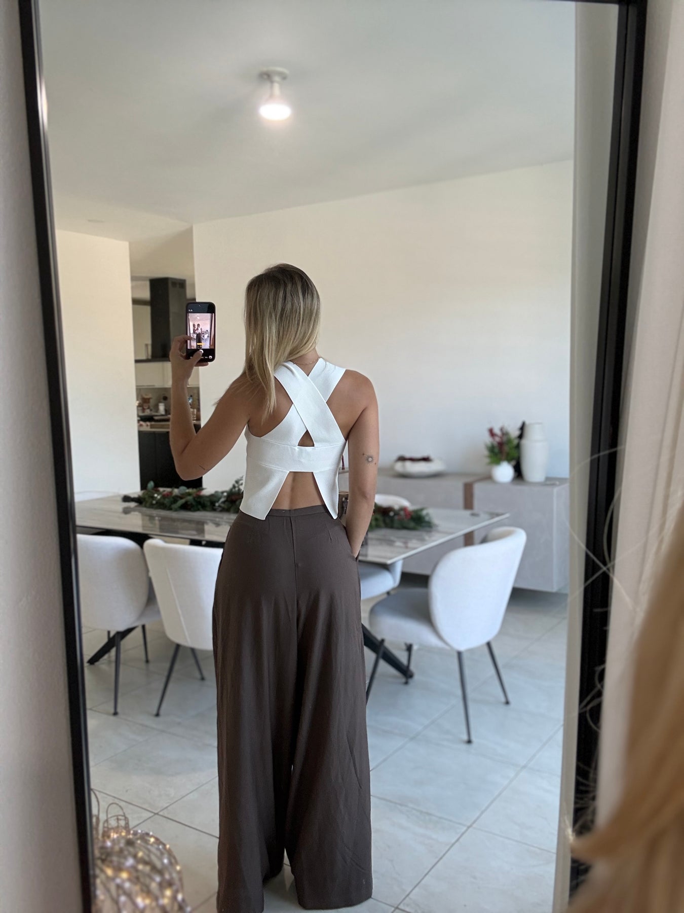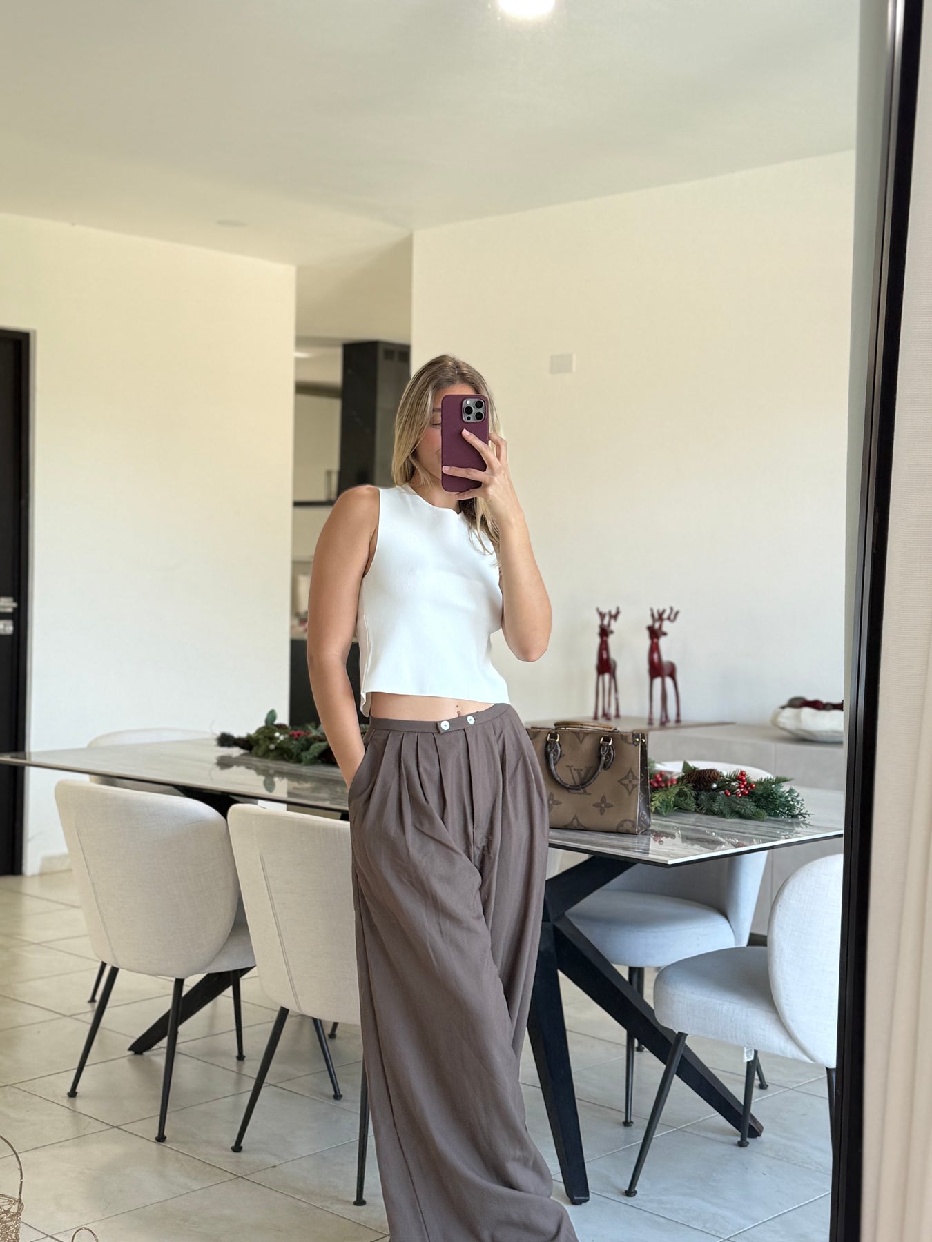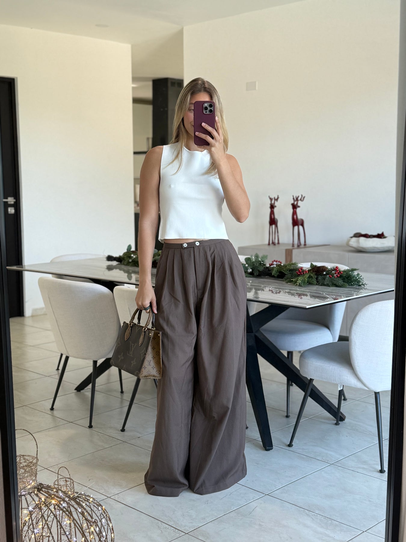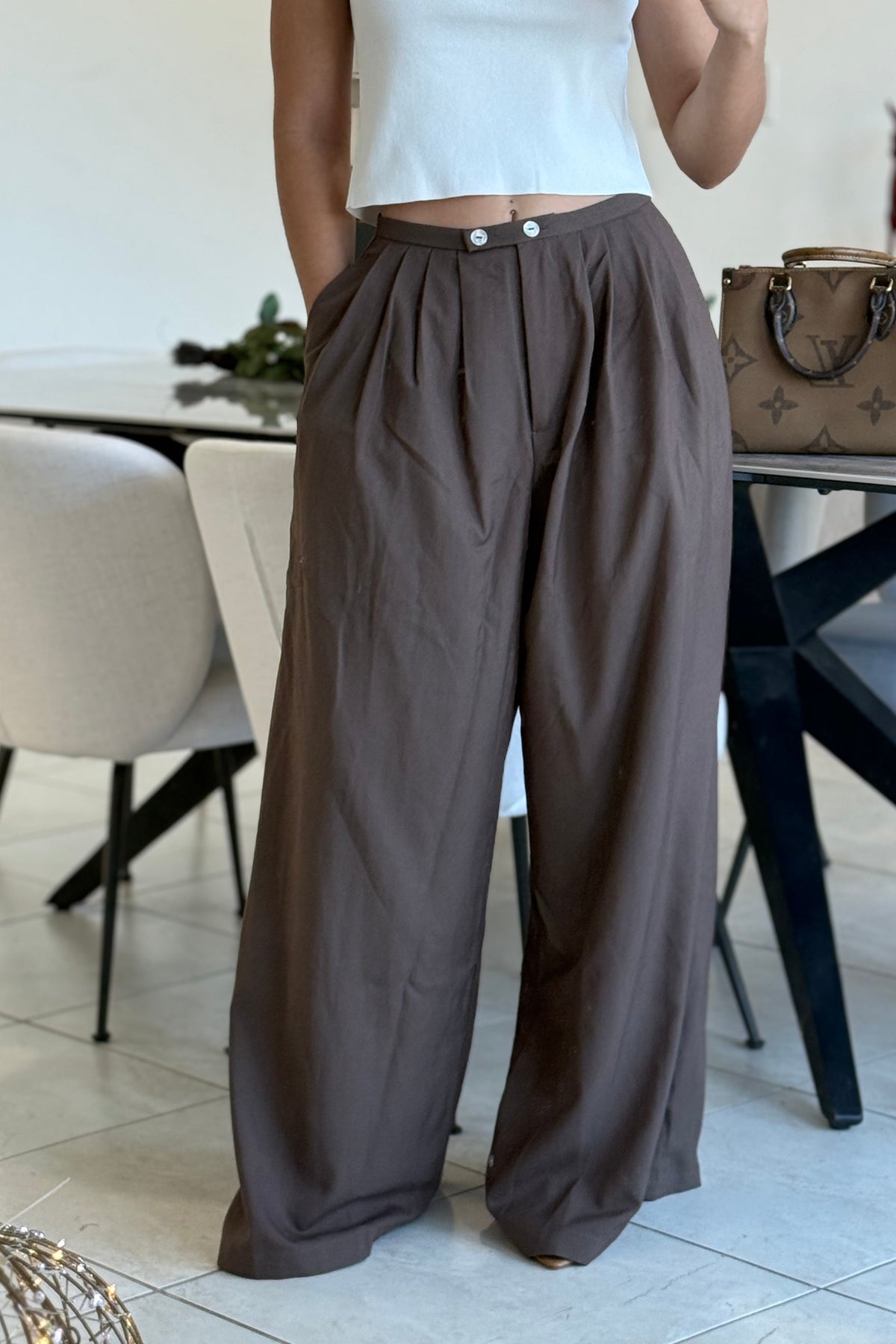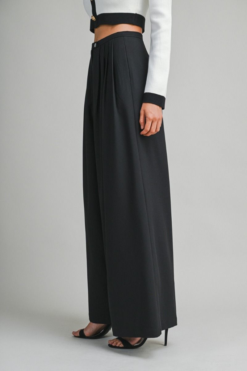 RUNS SMALL SIZE UP!!!!!!!                                              High-waisted relaxed fit wide-leg pants with front pleats and double-button detail at the waistband.