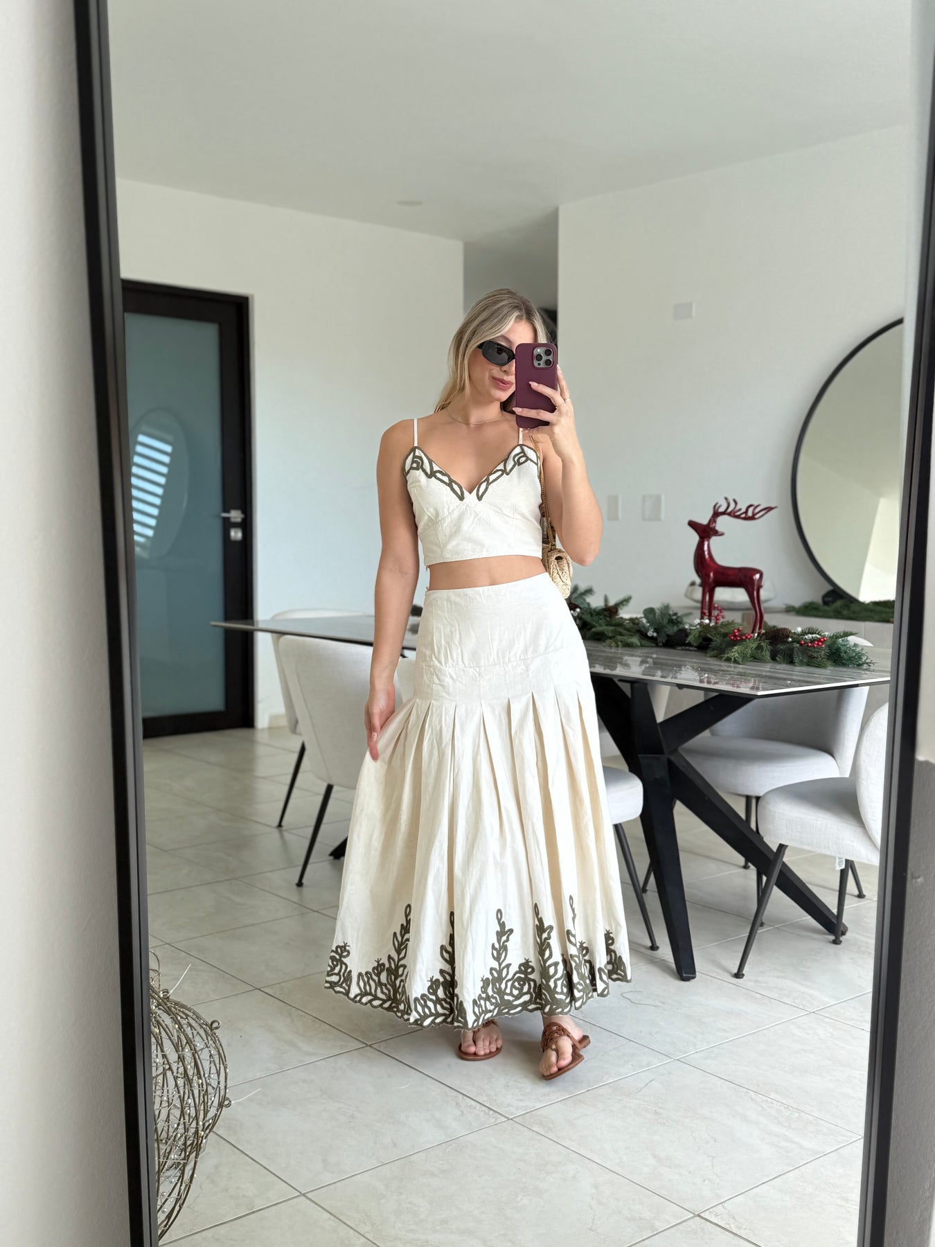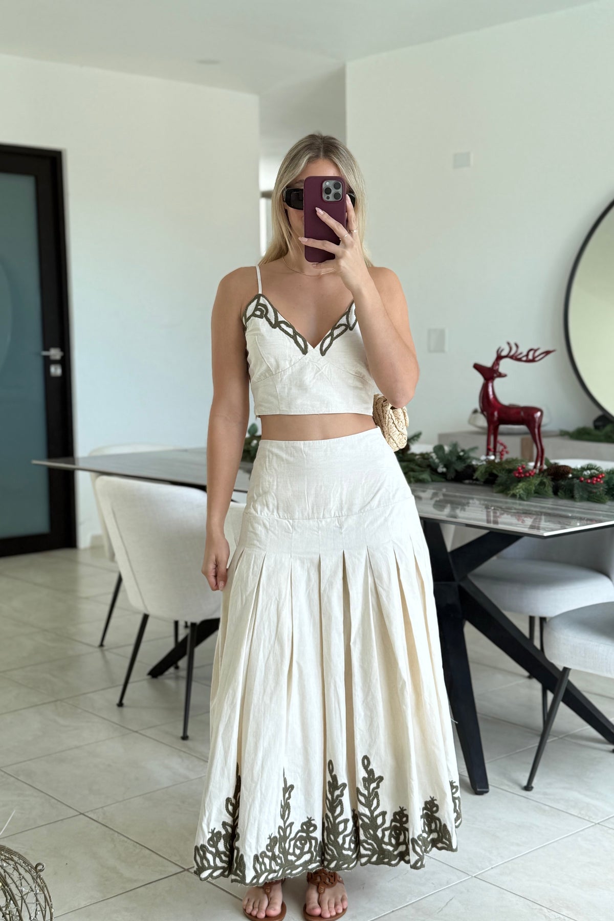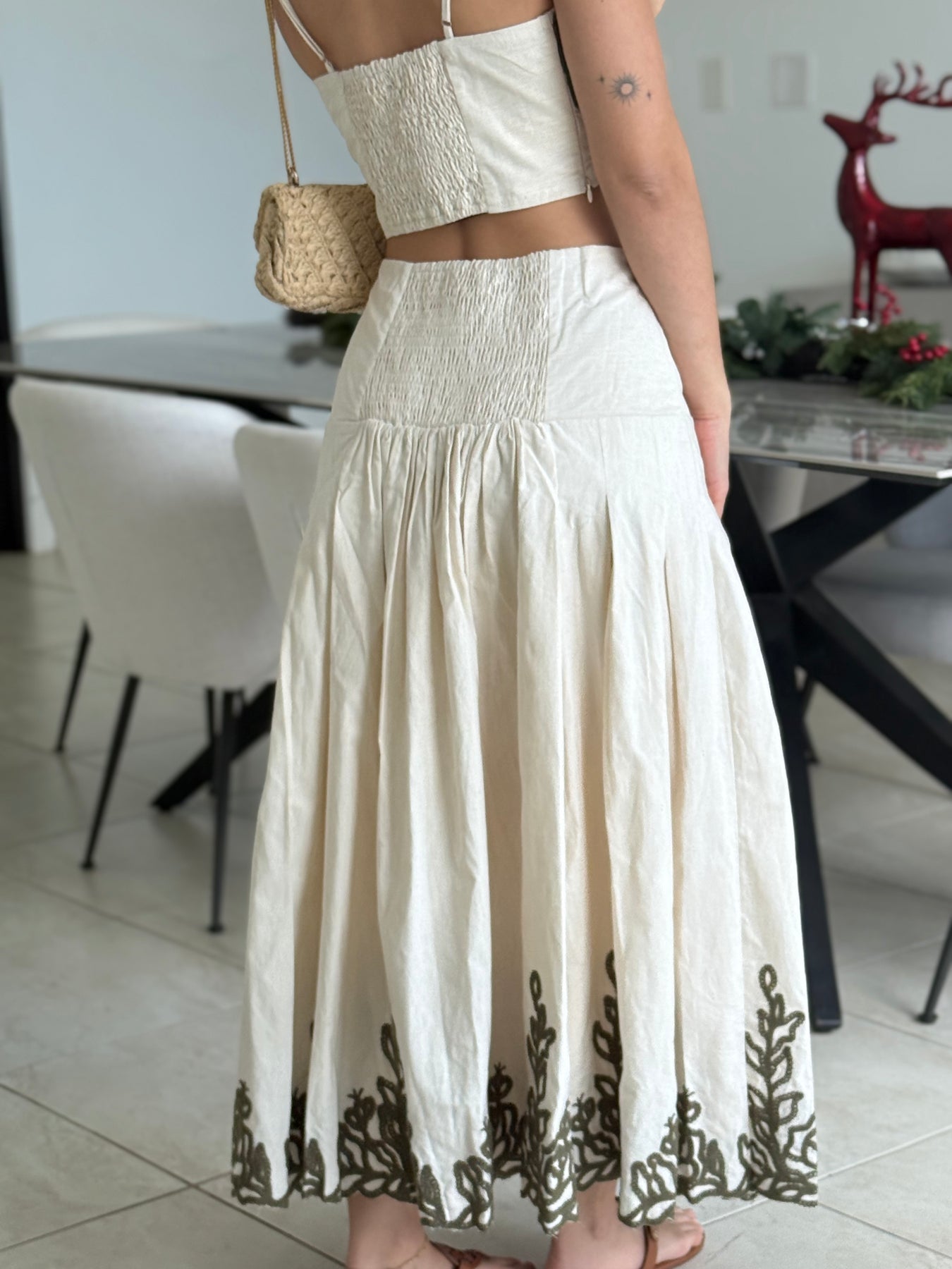 A beige two-piece set with olive botanical embroidery, featuring a bustier-style top, spaghetti straps, side zipper, and smocked back. The matching flared skirt and pleats, embroidered hem, and smocked at the back of the hips for added flexibility. Lightweight and perfect for warm weather.