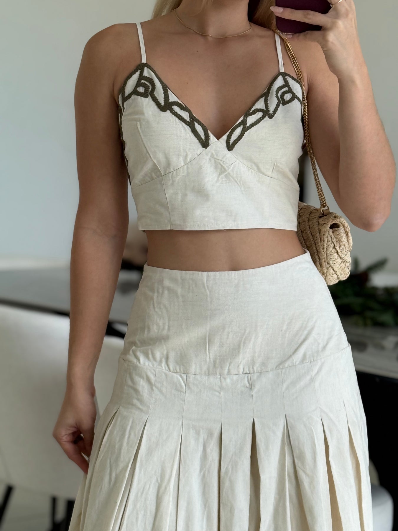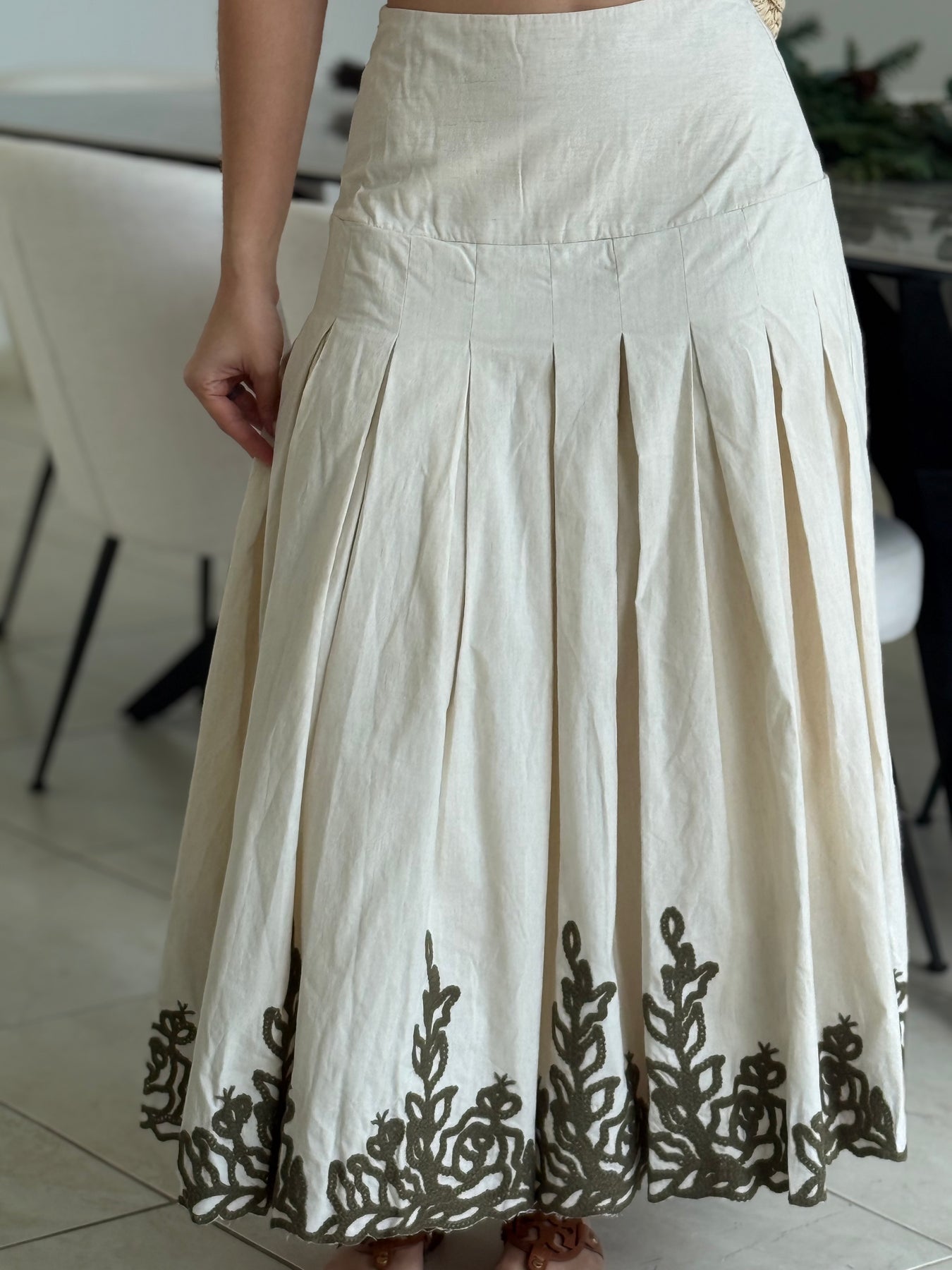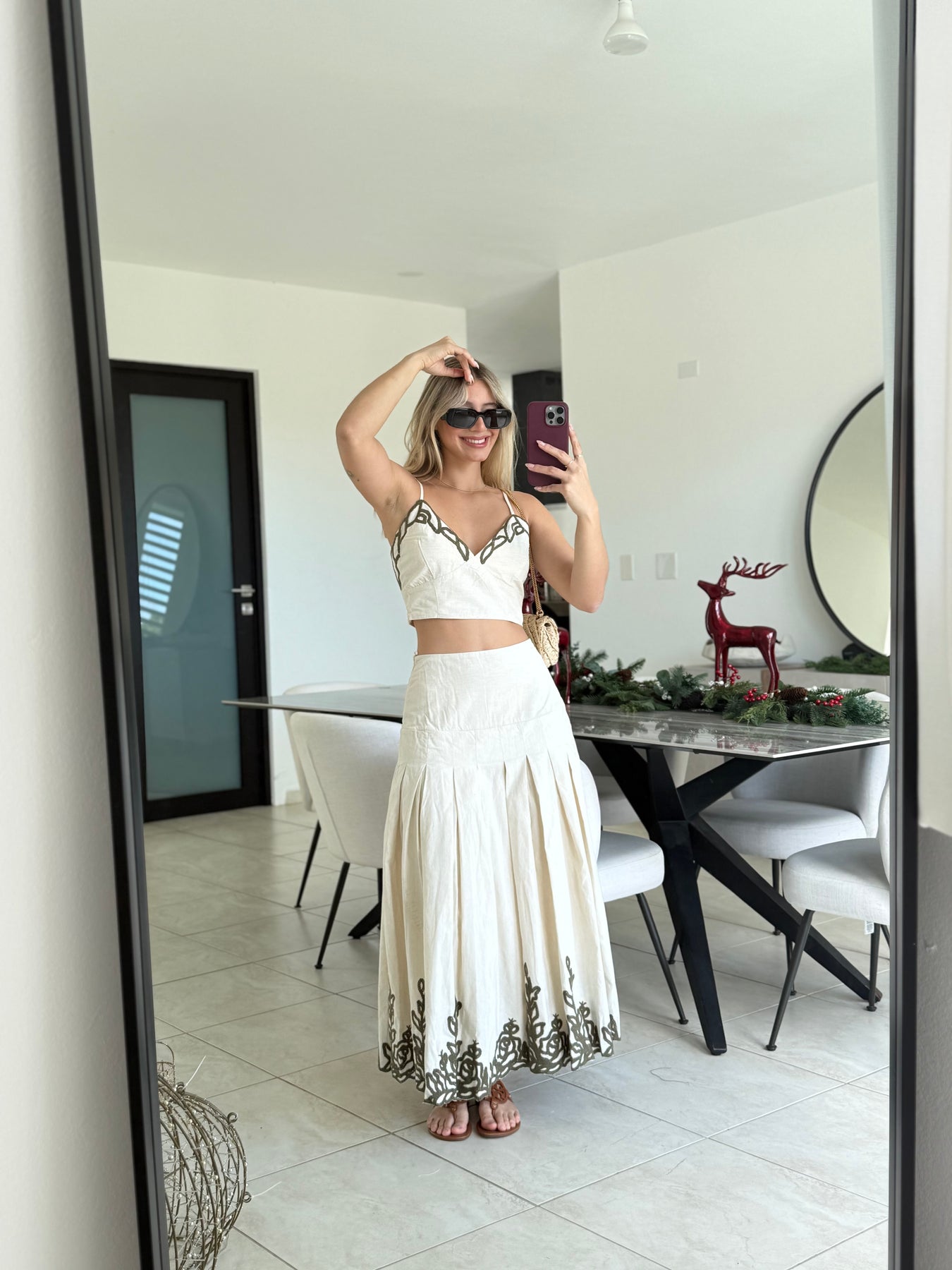 A beige two-piece set with olive botanical embroidery, featuring a bustier-style top, spaghetti straps, side zipper, and smocked back. The matching flared skirt and pleats, embroidered hem, and smocked at the back of the hips for added flexibility. Lightweight and perfect for warm weather.