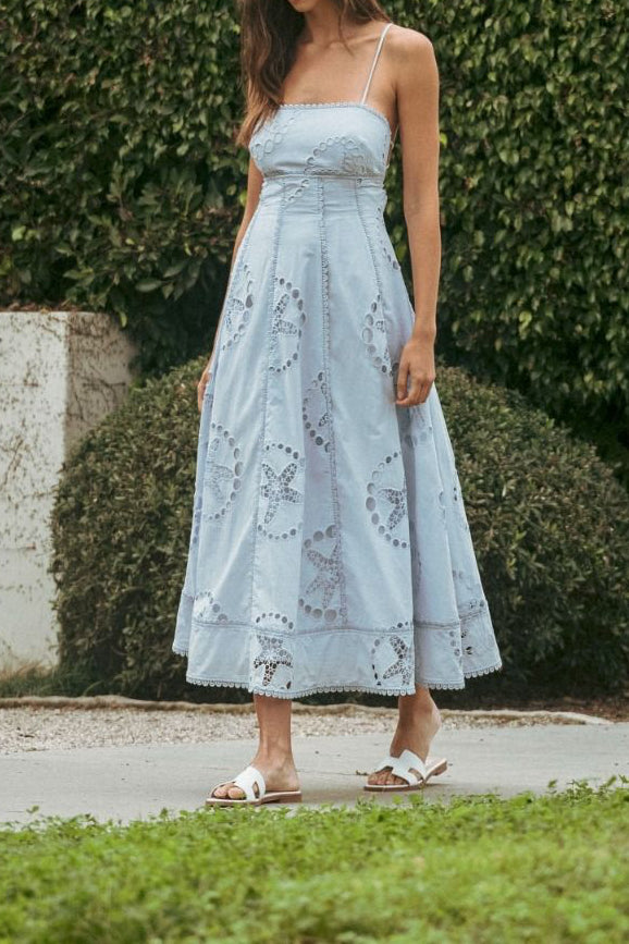 Sleeveless midi dress featuring adjustable spaghetti straps and a straight neckline. Designed with an open back and crisscross lace-up tie detail. Finished with an allover nautical eyelet cutout pattern and a scalloped hem. Back invisible zipper. Lining.