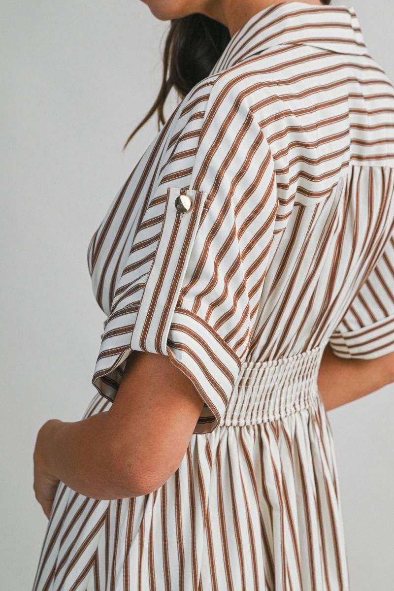 Striped shirt-style midi dress featuring a notched collar, short cuffed sleeves, and a wide contrast waistband with button closure. Back smocked at waist. Lining.