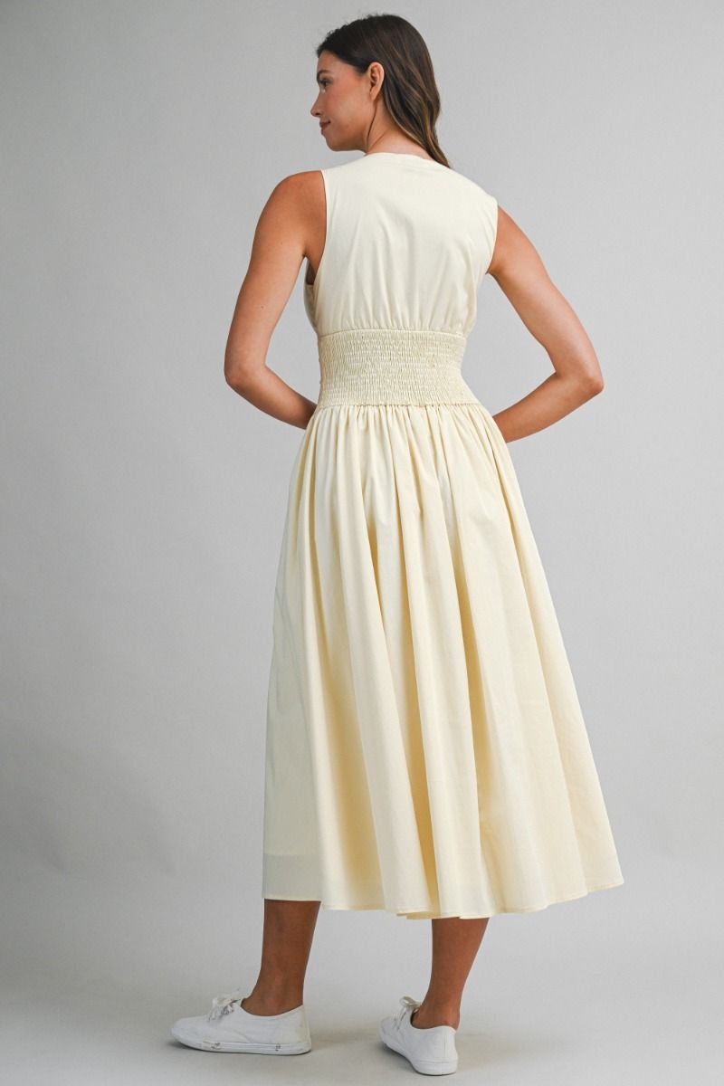 Sleeveless midi dress detailed with a scalloped neckline and a structured, fitted bodice. Designed with non-functional buttons front, a smocked back waistband, and a gathered full skirt. Side invisible zipper. Lining.