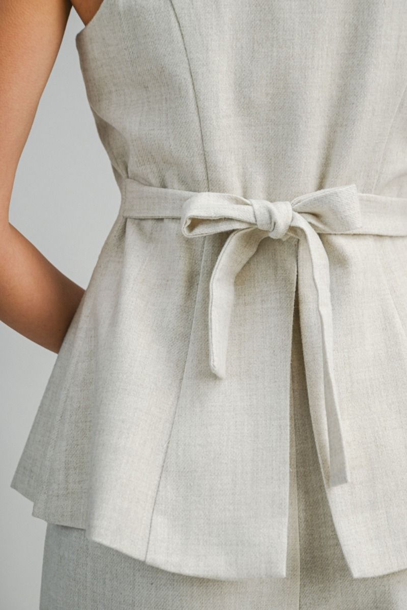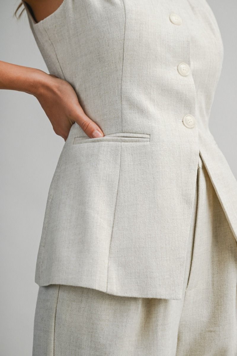 Solid tailored longline button down vest with back tie and slit detail and matching wide leg pants set.