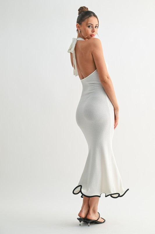An effortless statement piece. The Selene Wave Midi Sheer Dress, features a halter neckline with a self-tie at the back, a flattering open back silhouette, and a playful wave trim at the hem. Crafted in a structured, textured knit that lightly hugs your figure before flaring into a soft midi length.
