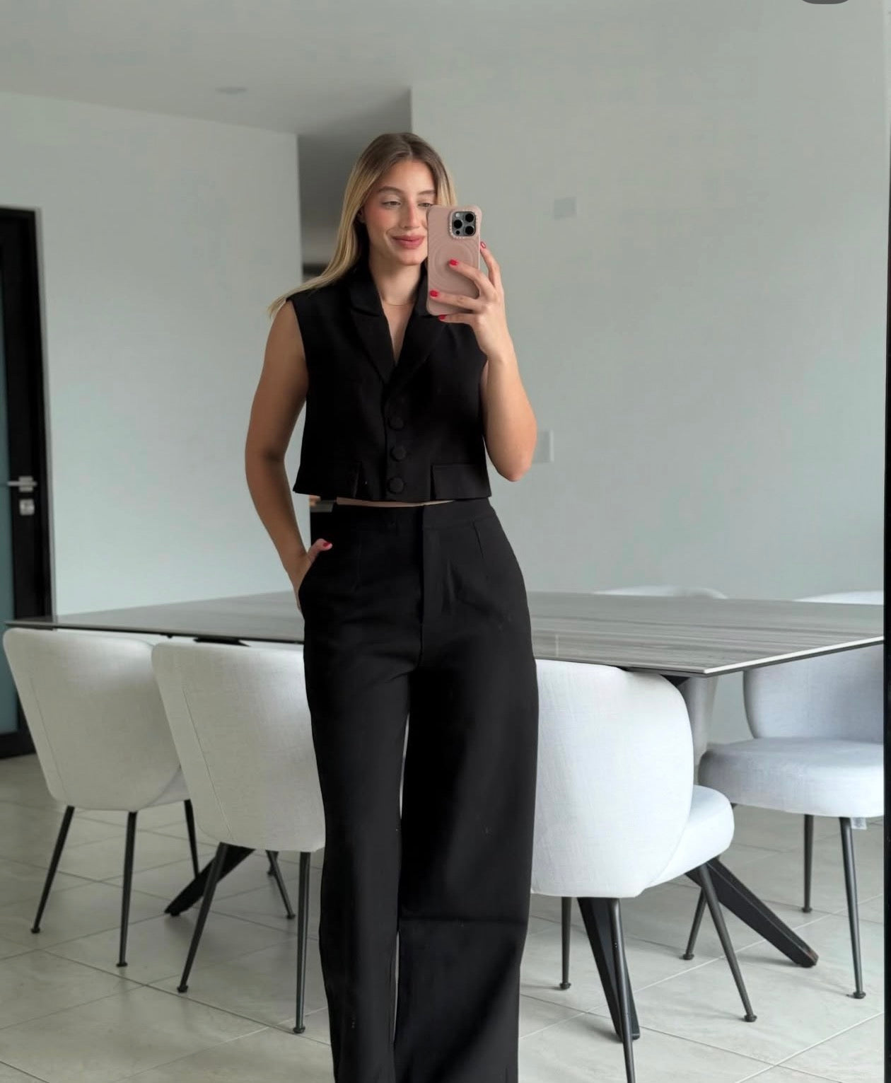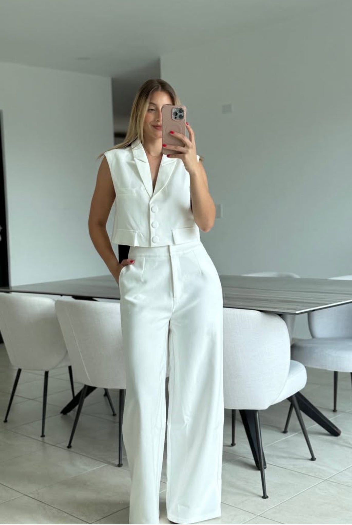 Sleeveless v neck collar flap detail button down crop vest jacket top and matching front button closure long pants set. Pants has side pocket. Lining.