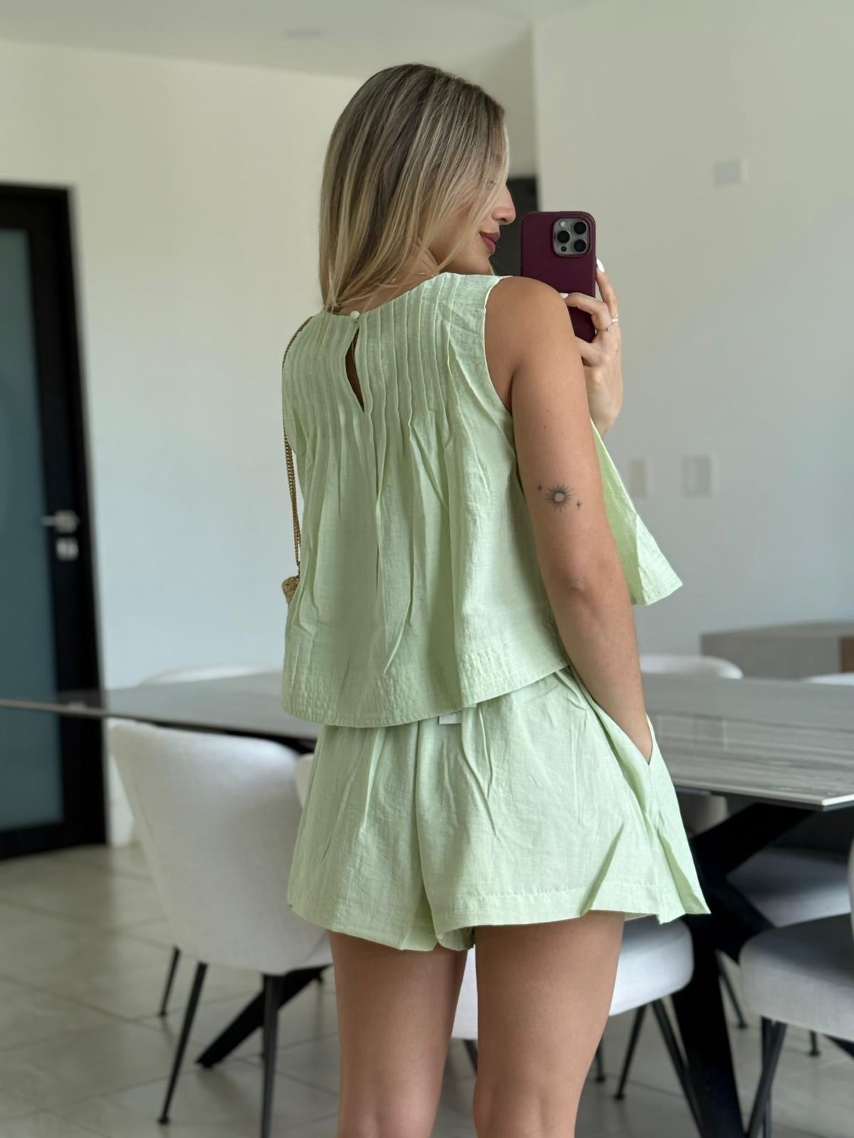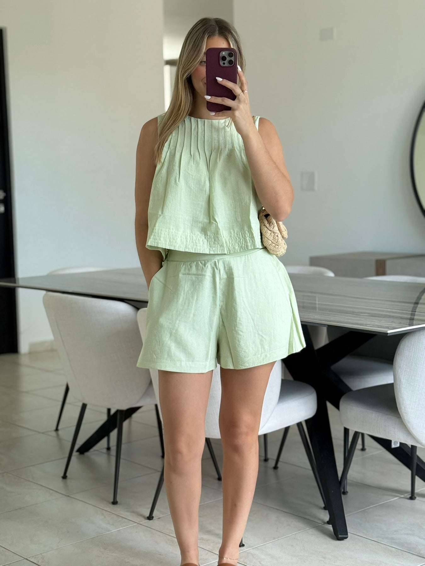 Two-piece woven set designed with a lightweight textured fabric. The sleeveless top features a round neckline with soft pleated detailing at the front and a cropped silhouette. Finished with a back keyhole button closure. The matching shorts are designed with a high-waist fit, back elastic waistband, and side pockets. Lining.