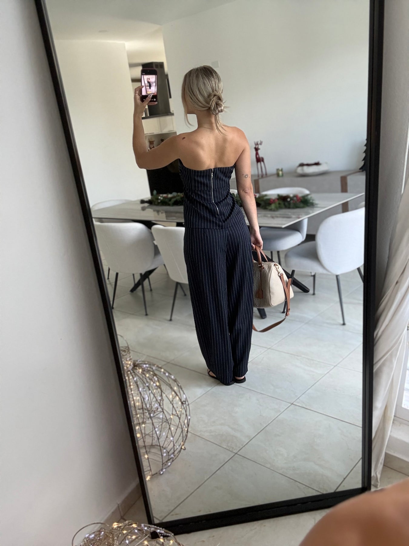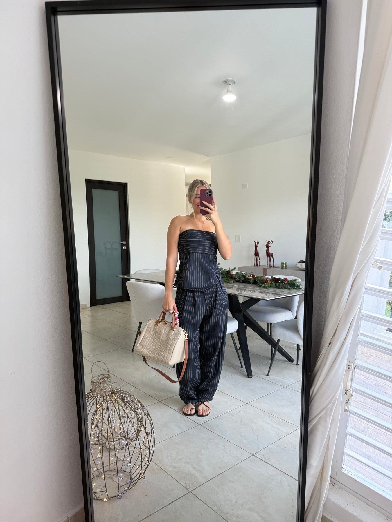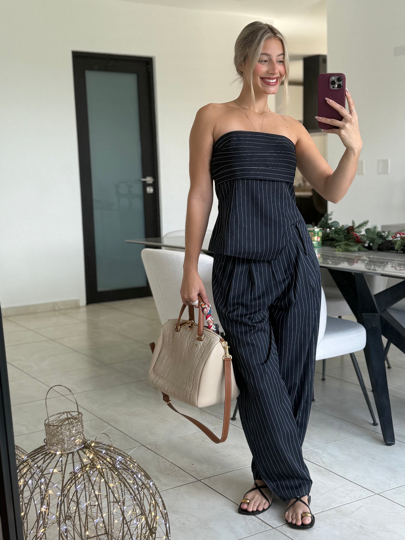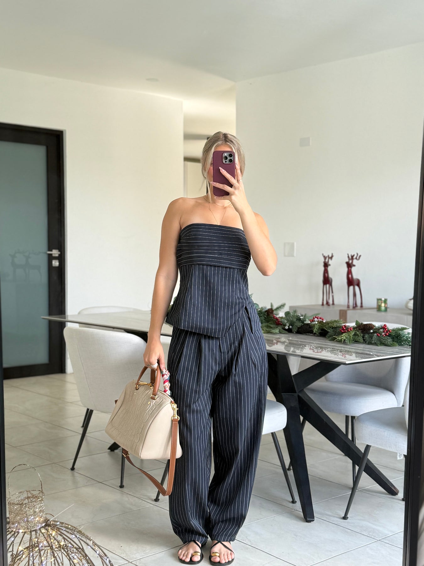 Pinstripe two-piece set featuring a strapless tube top with asymmetric hem and back exposed zipper closure, paired with relaxed cropped barrel-leg trousers. Lining.