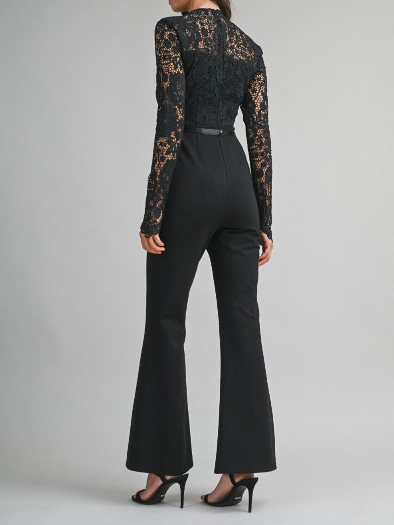 Long sleeve jumpsuit featuring a lace bodice with a high neckline and sheer sleeves. Designed with a fitted waist, bow belt and straight-leg pants. Back invisible zipper closure. Lining.