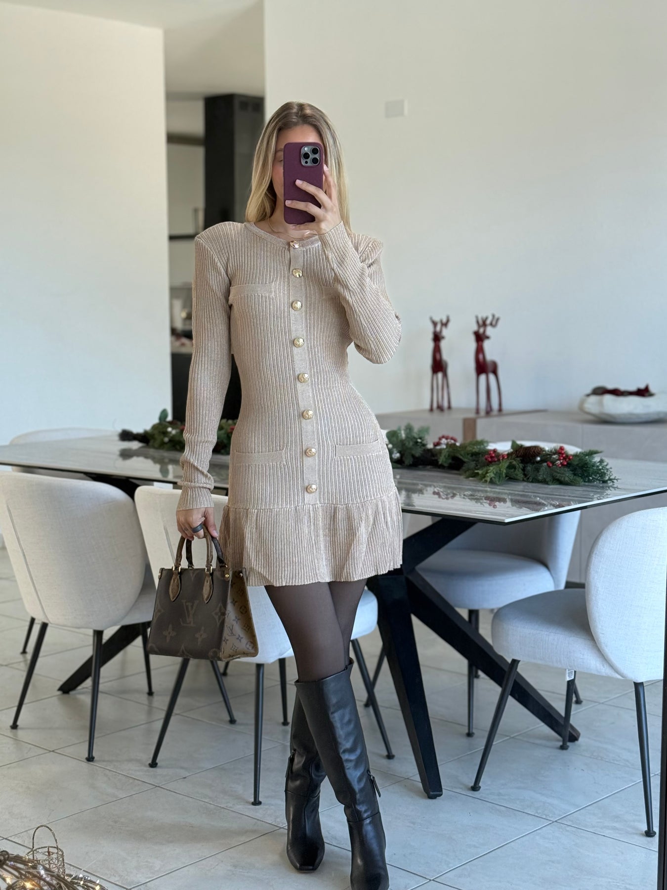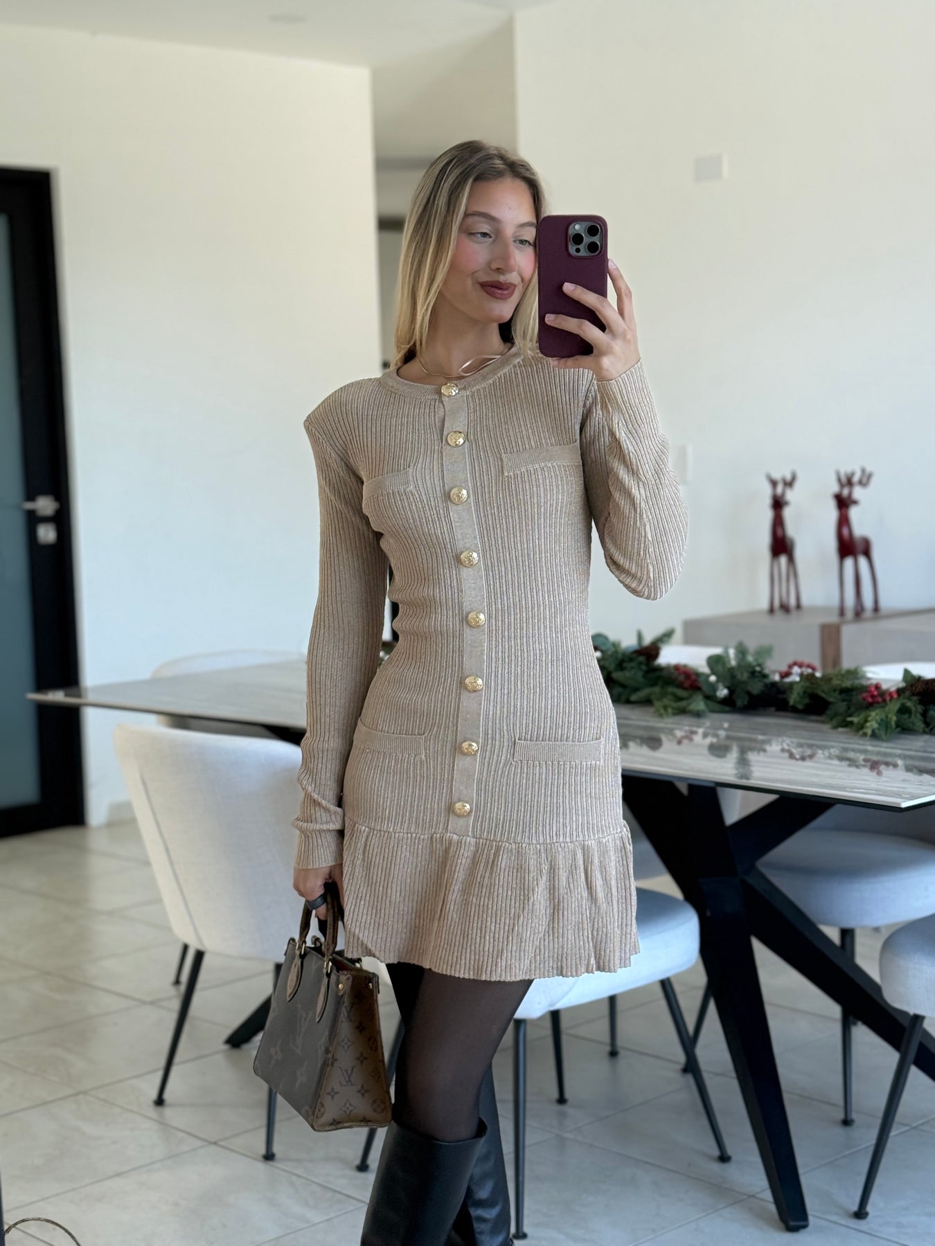 Long sleeve lurex knit mini dress with crew neckline and gold button front (only first button is functional). Ribbed textured, the fitted silhouette and pleated ruffle hem skirt.