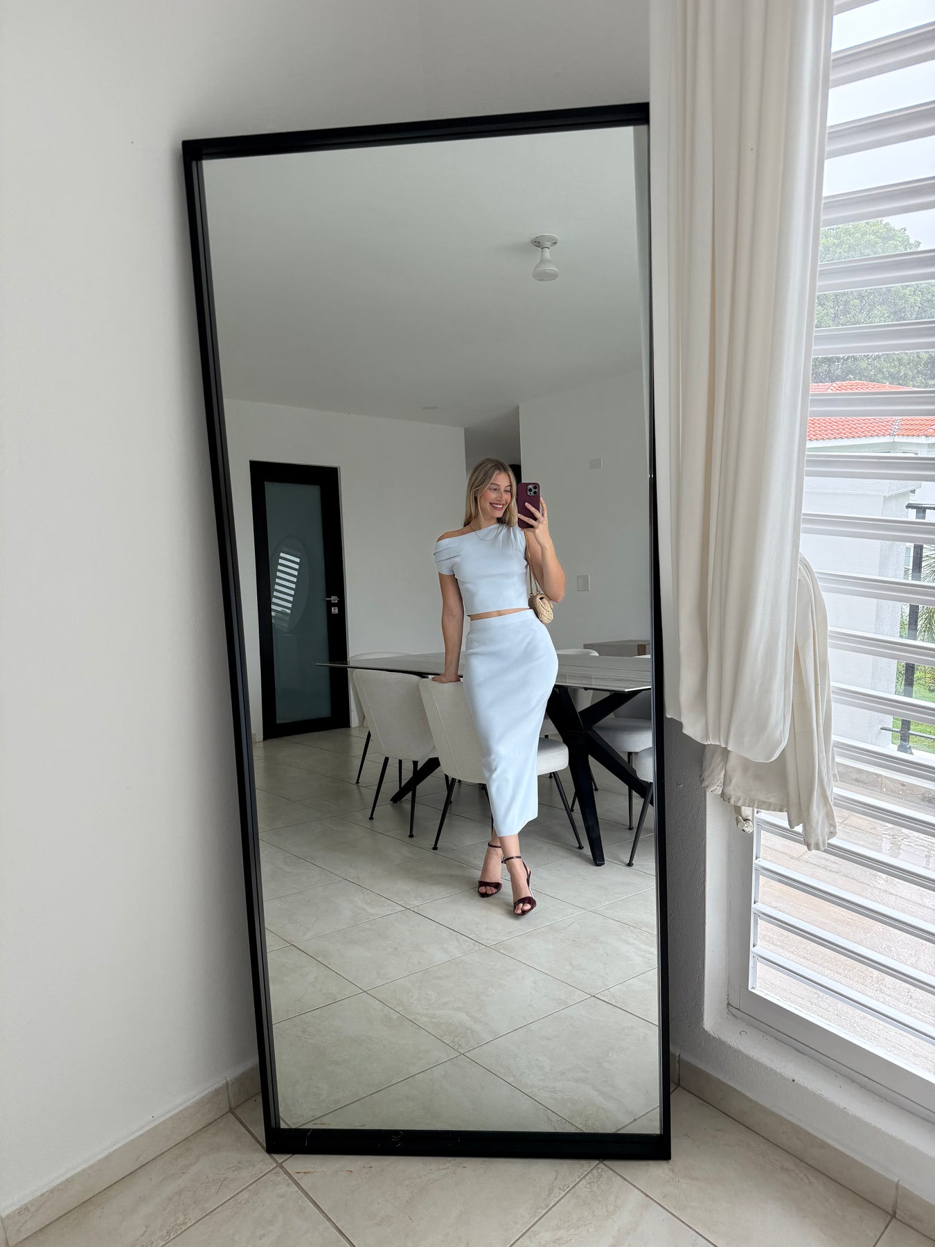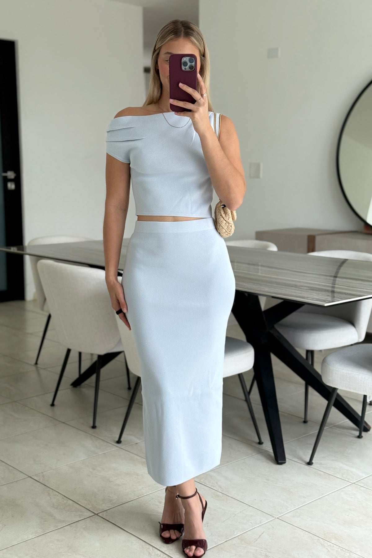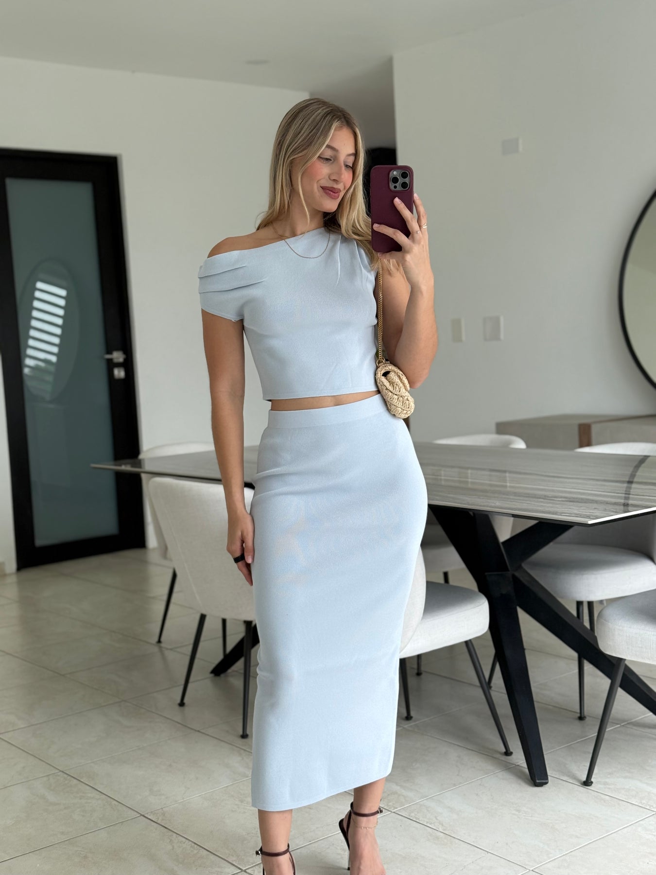 Two-piece knit set featuring an asymmetric one-shoulder crop top with a fitted silhouette. Paired with a high-waisted midi skirt designed with a back slit and a straight, body-skimming fit.