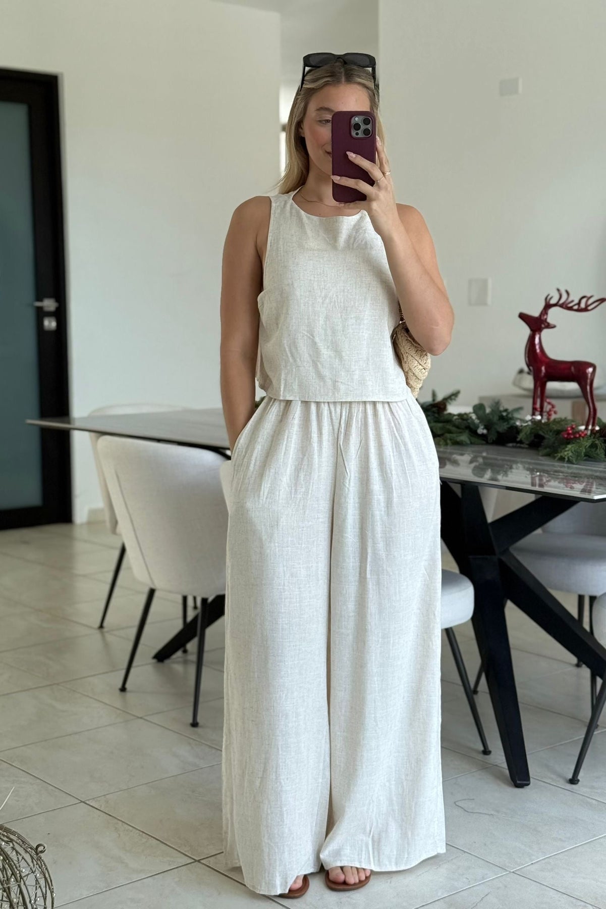 SLEEVELESS LINEN JUMPSUIT WITH BACK SLIT OPENING WITH A BUTTON CLOSURE/ NOLINING
